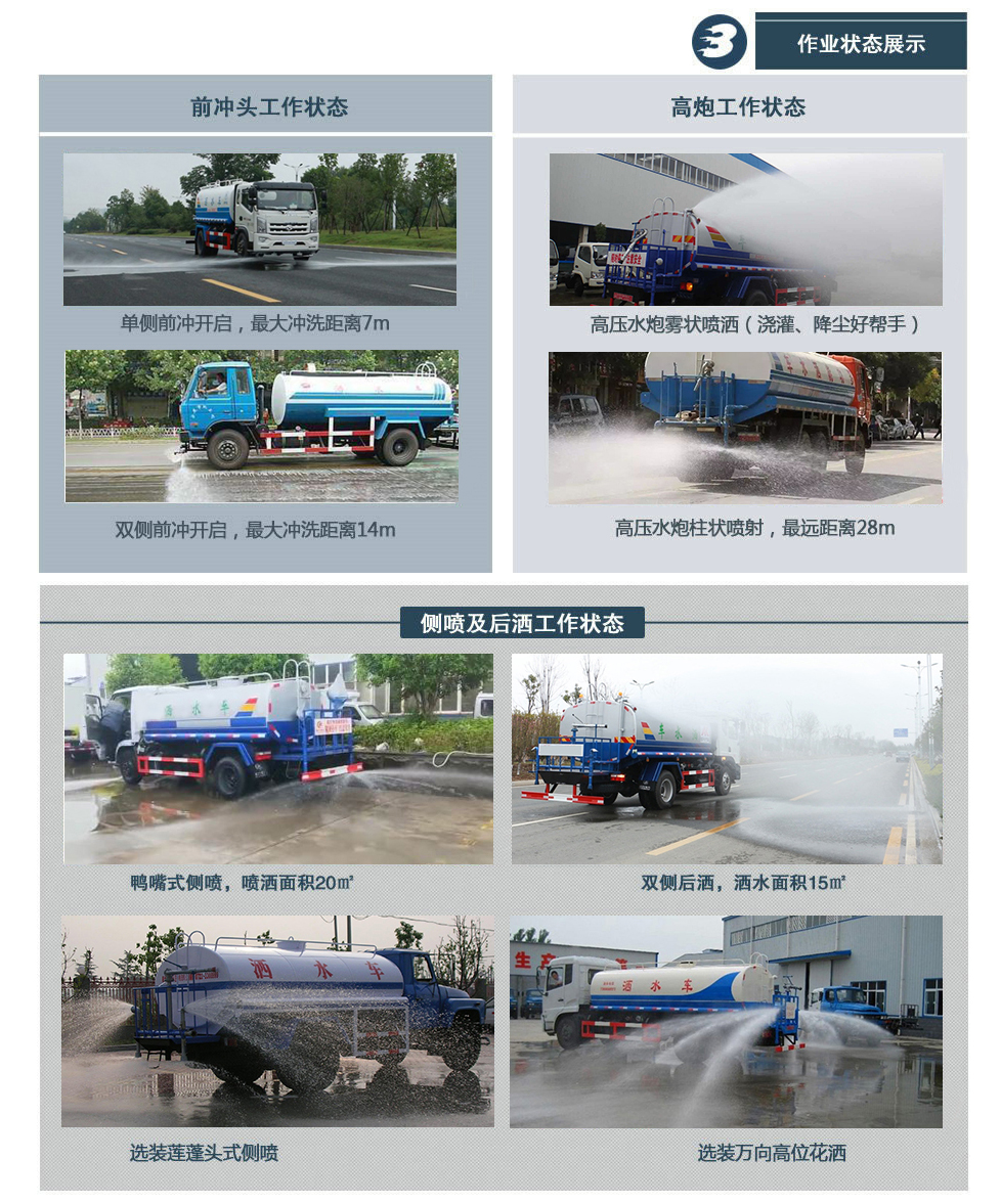 標準: 泵性能符合機械部標準《灑水車技術條件》QC/T29114-93中對泵規(guī)定的要求。沖水距離在20米以上,楊程30米以上,每分鐘1000轉(zhuǎn),自吸高度6米。