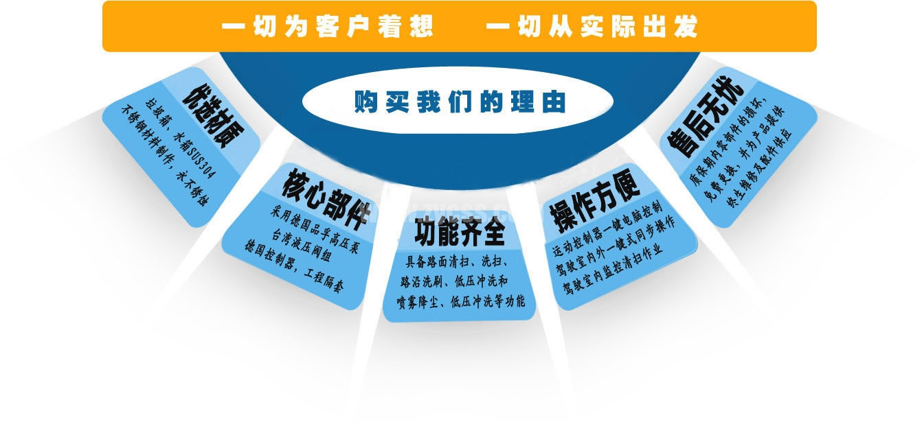 1、帶2個中置掃盤;中置超寬吸嘴;雙層吸塵筒;康明斯170馬力副發(fā)動機;臺灣液壓閥;大力馬達;德國高壓水泵(前沖/側噴/中噴/后噴霧)/側沖洗水槍/垃圾箱自潔裝置);萬向高壓路沿清洗;威龍低壓泵(前沖),氣動球閥控制;4mm不銹鋼垃圾箱;不銹鋼水箱;德國控制器;尾部箭頭燈;機油、垃圾箱、水箱均帶防溢或低位報警裝置;倒車及洗掃狀態(tài)室內(nèi)監(jiān)視器;多種語音提示;倒車自動保護、防傾倒垃圾翻車保護、檢修安全保護;20m高壓沖洗卷盤;刷臂轉動機構使用德國進口高新耐磨工程隔套,免打黃油;精密冷彎無縫液壓油管;運動控制器一鍵電腦控制。